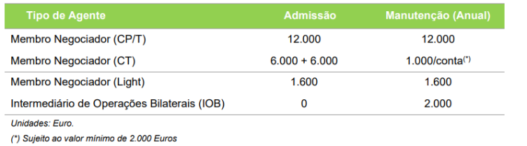 Todos os membros ou participantes do mercado estão sujeitos ao pagamento de uma comissão no momento de admissão, sendo que é também devida uma Comissão de Manutenção Anual, com a estrutura constante da tabela seguinte.